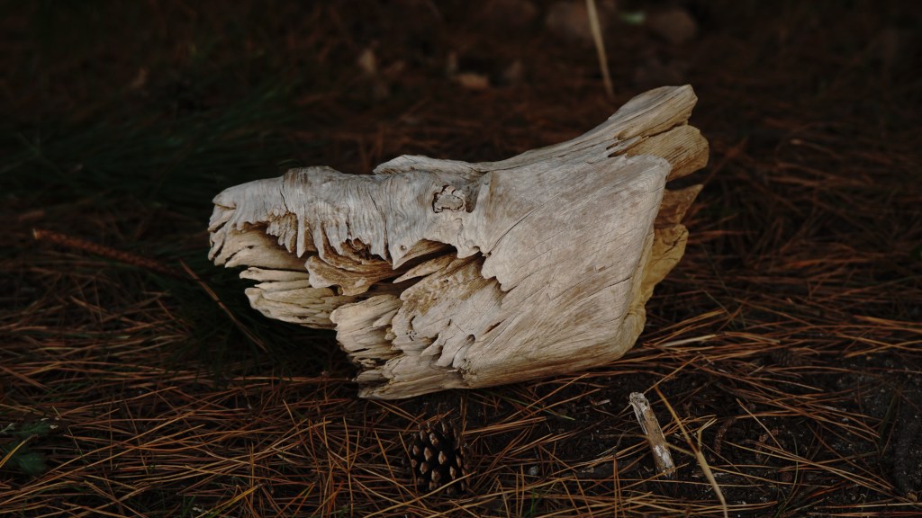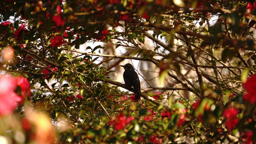 Captions for slide show: 1. A brilliant pink and yellow flower against green leaves. 2. A pale piece of driftwood that resembles some kind of beast’s skull, atop a pine-needle bedding. 3. A small green bird perched on a bare branch, with a bright pink flower nearby. 4. The silhouette of a bird encircled by leafy, flowered branches.